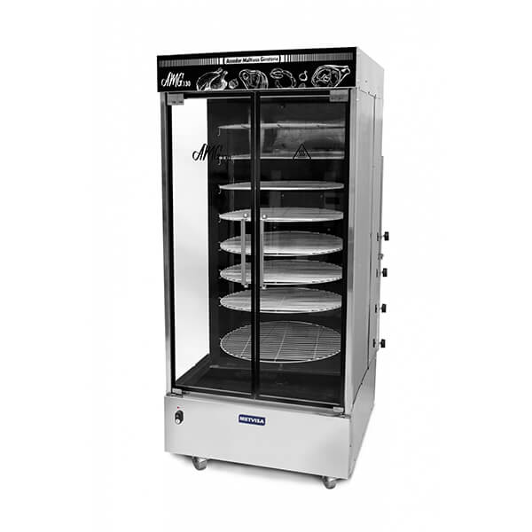 Com 8 (oito) grelhas, 9 (nove) queimadores e sistema giratório, a AMG-130 garante um perfeito assamento de frangos, batatas e carnes em geral.