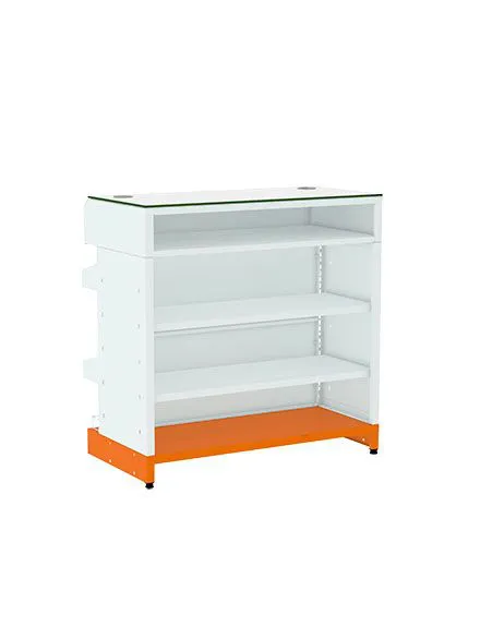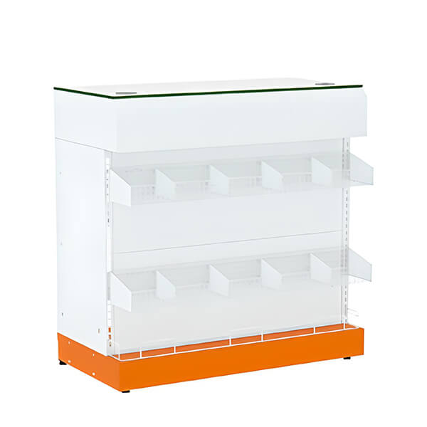 Alinha conforto para o usuário a uma exposição eficiente de produtos, visando a melhor experiência para cliente e vendedor, desenvolvido para resistir aos mais variados cenários, acompanha em sua estrutural frontal 2 cestos com 4 divisores cada e 1 anteparo na base. Possui 3 bandejas de aço na parte interna.