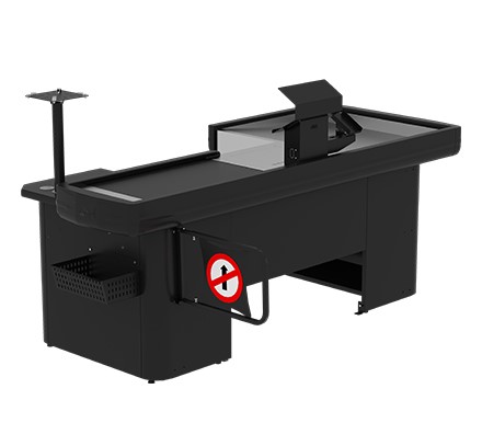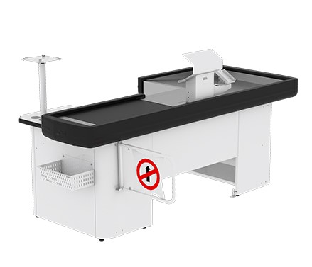 Possui design moderno e atende à norma ergonômica NR17. Este modelo inclui pista inclinada, que facilita a movimentação de muitos itens. Também possui cancela, cesto para descarte, gaveta multiuso e kit automação, composto por suporte para teclado e para monitor. Tem preparação para balança compatível com Toledo 8217. Sistema de automação com esteira opcional. Não estão inclusos a balança e o porta dinheiro.