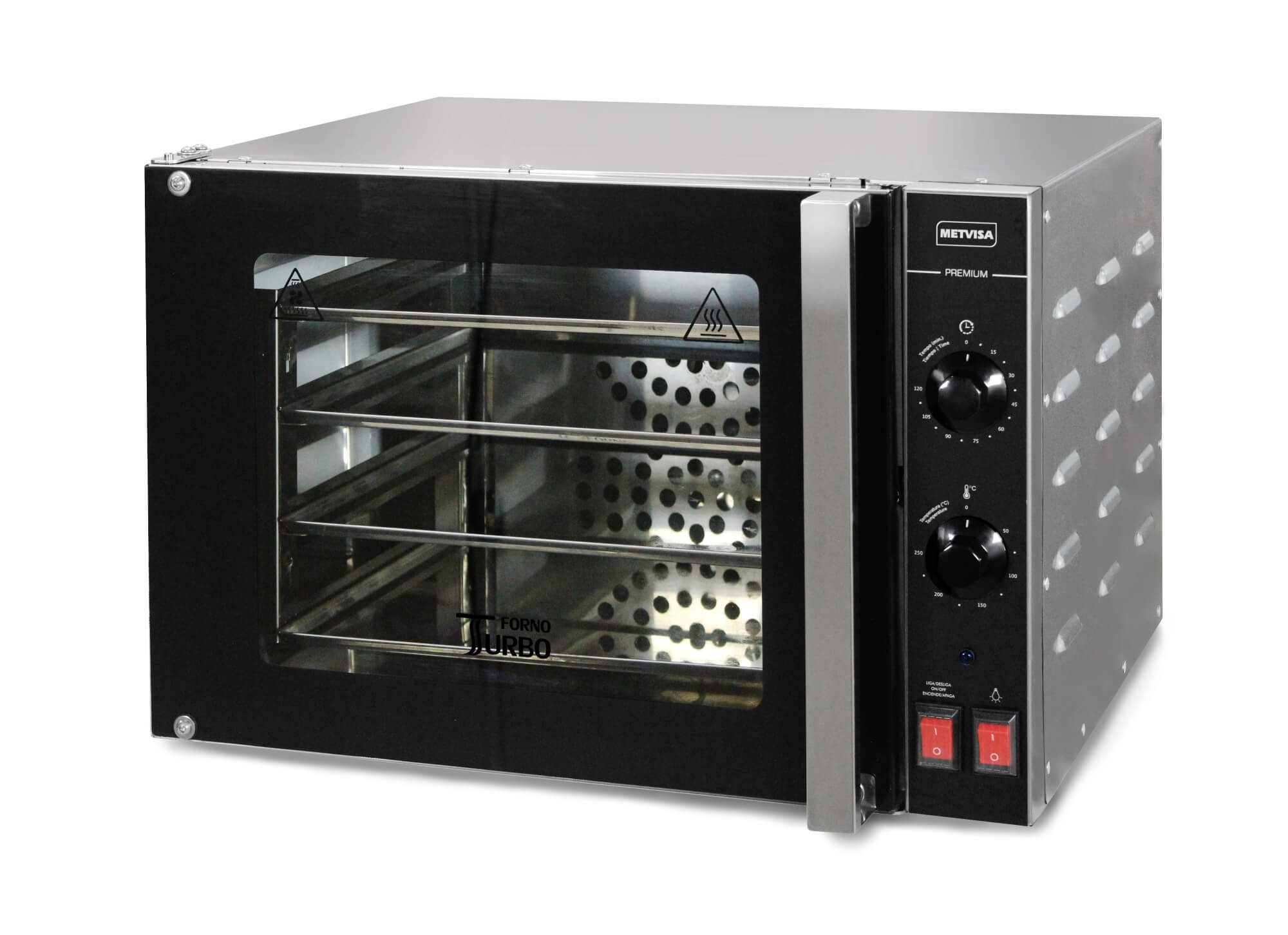Forno turbo com capacidade interna de 65 L. Revestido em aço inox, com isolamento térmico e 4 assadeiras. Ideal para assar salgados e doces para padarias, lanchonetes e lojas de conveniências.