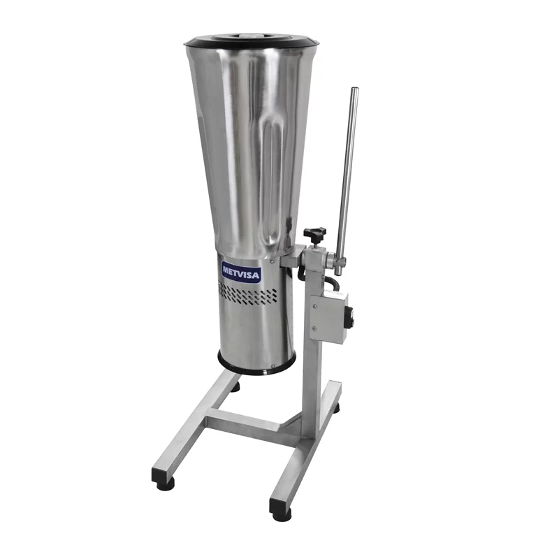 O liquidificador industrial de baixa rotação é feito de aço inoxidável. O conjunto do mancal, hélice e copo também são de aço inoxidável, e a tampa é de plástico com alta vedação. A nova tampa possui um visor que permite a visualização e adição de alimentos sem precisar retirá-la. Este modelo é especialmente projetado com uma base em alumínio e um conjunto de retentor e mancal reforçado, sendo perfeito para quem precisa processar produtos específicos que exigem mais resistência.